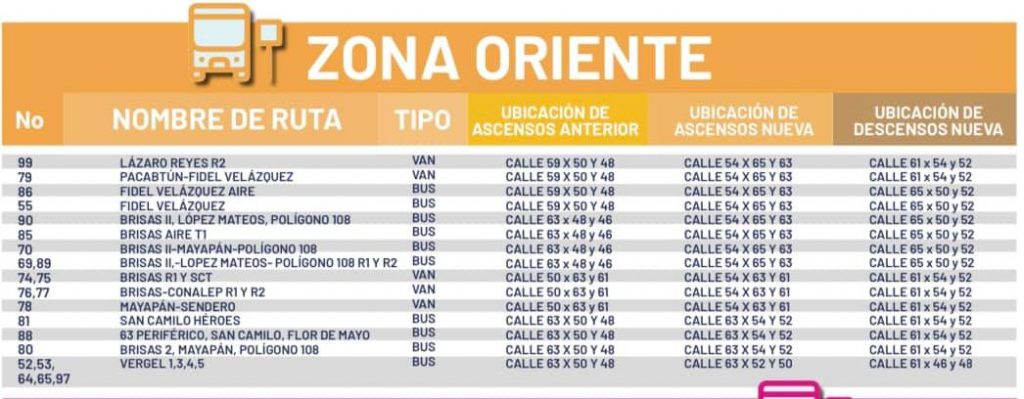 Para la zona oriente, las rutas Lázaro Reyes R2 y Pacabtún-Fidel Velázquez tendrán su área de ascenso en la calle 54 x 65 y 63, y de descenso en la calle 61 x 54 y 52; los camiones de Fidel Velázquez Aire, Fidel Velázquez, Brisas II-López Mateos-Polígono 108, Brisas Aire T-1, Brisas II-Mayapán-Polígono 108, Brisas II-López Mateos-Polígono 108 R1 y R2 tendrán su ascenso en la calle 54 x 65 y 63 y su descenso en la calle 65 x 50 y 52.
