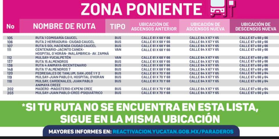 En lo que a la zona poniente respecta, la Ruta 1 Comisaría Caucel, Ruta 2 Herradura-Ciudad Caucel, Ruta 5 Sol Hacienda Ciudad Caucel, Centenario-Jacinto Canek-Hospital O’Horán-Inalámbrica-Av. Zamná, Mulsay-Yucalpetén, Ruta 15 Almendros, Ruta 4 Animaya-Bicentenario, Ruta 17 Almendros 7 modificarán su lugar de ascenso a la calle 64 x 67 y 65, y de descenso a la calle 67 x 68 y 66.