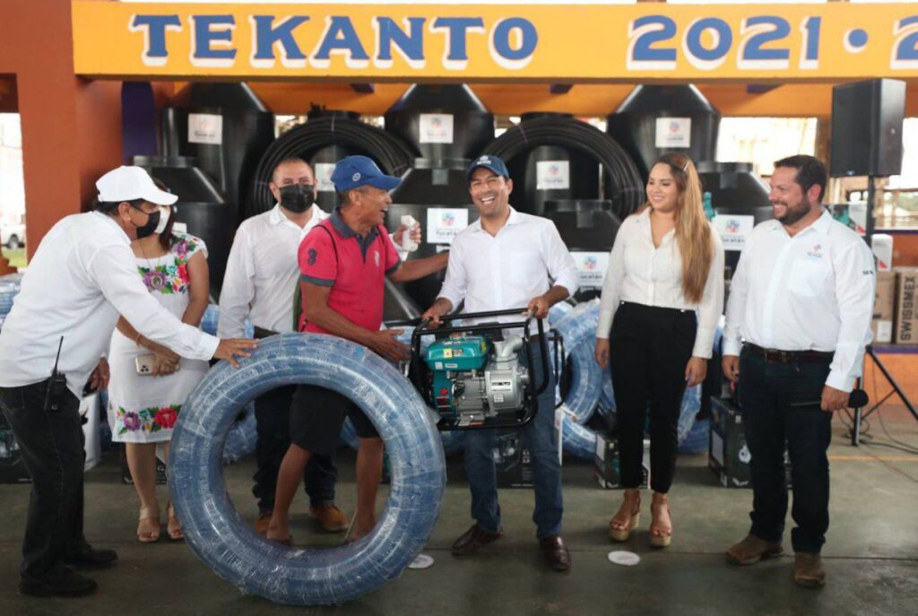 En Tekantó, los beneficiarios de este programa recibieron azúcar, equipo apícola, motosierras, mangueras para sistemas de riego e hidráulicas, alambre de púas, carretillas, bombas aspersoras, tinacos, triciclos, motobombas y maya borreguera, entre otros insumos, y para respaldar a quienes se dedican a la crianza de animales, se otorgó 4.2 toneladas de alimento balanceado para cerdo a 6 trabajadores, y 4 para pavo, en pro de 7 familias.