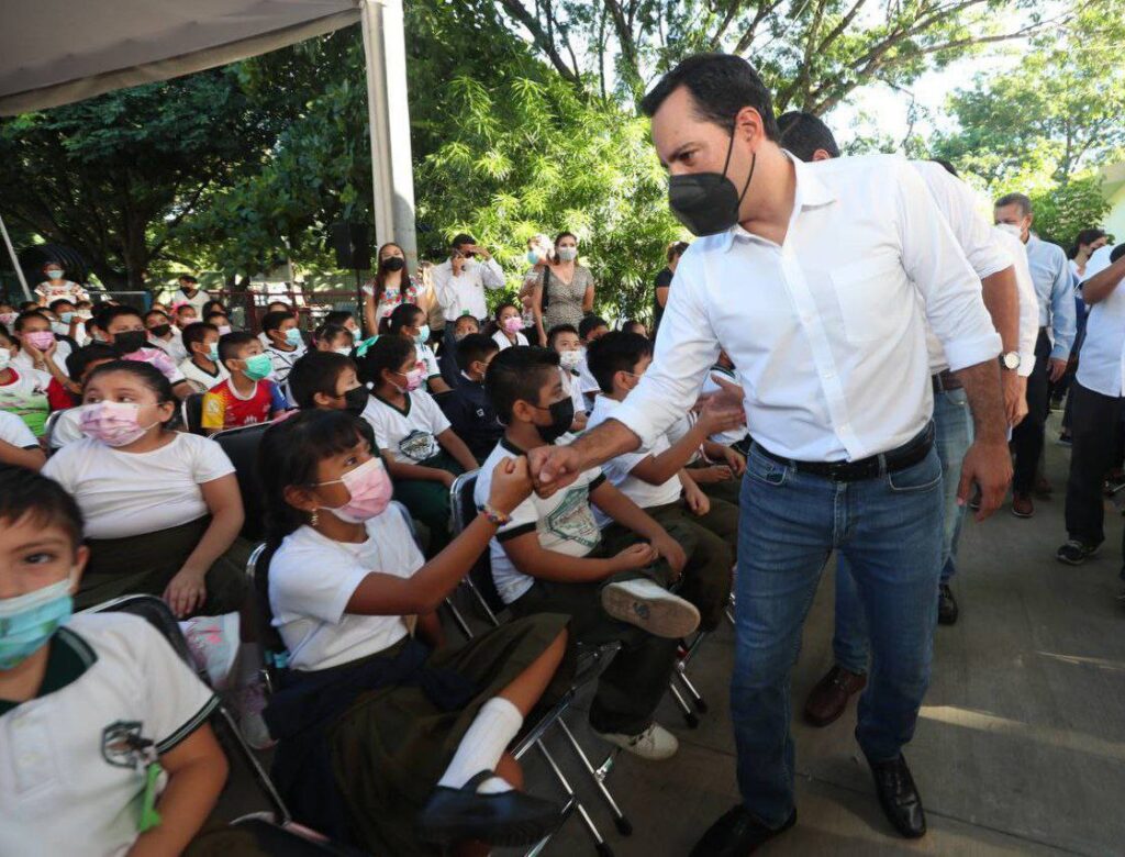 “Este es un esquema para apoyarles a ustedes y a sus familias porque el regreso a clases representa un gasto importante y con esto ayudamos por 3 vías: le damos a las niñas y a los niños lo necesario para poder venir a la escuela, esto de forma equitativa, pues no hay nada más triste que un niño no tenga sus útiles completos y ayudamos a mamá y papá con un gran ahorro económico, por eso damos este apoyo en todas las escuelas públicas de Yucatán”, indicó el Gobernador ante el director del turno matutino de esta escuela, Emanuel González Chávez.